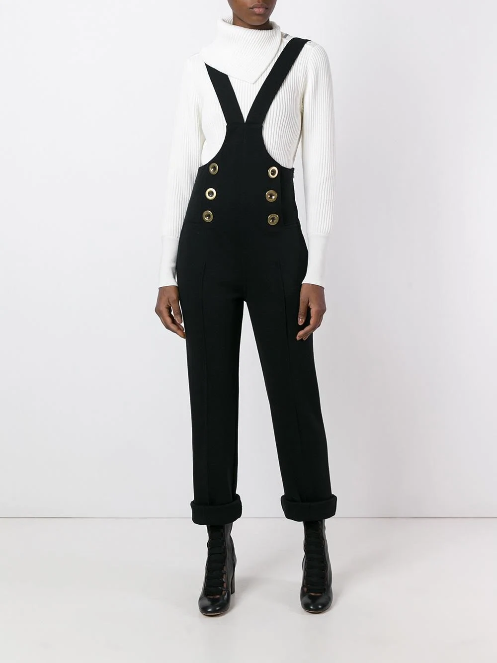 These Chloe dungarees are fabulous, designed more like high-waisted trousers than overalls. The double-front button detailing gives them a slightly military vibe, which immediately adds?polish to the look, while the line of the straps, which spread from the centre of the body outward to the shoulders, will help even out your proportions by aligning with your?hips. These will take you anywhere.