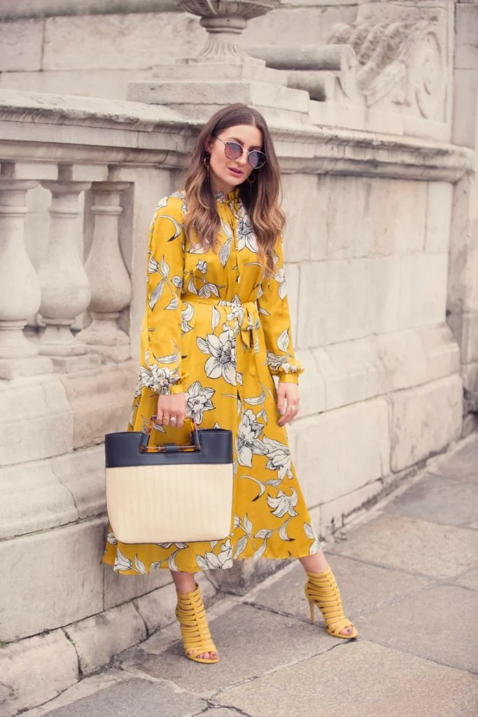 Yellow, the colour of sunshine and eternal optimism, shines brightly throughout. The standout piece is a yellow floral print maxi dress, which is the perfect day-to-night piece when paired with sandals or strappy heels.
