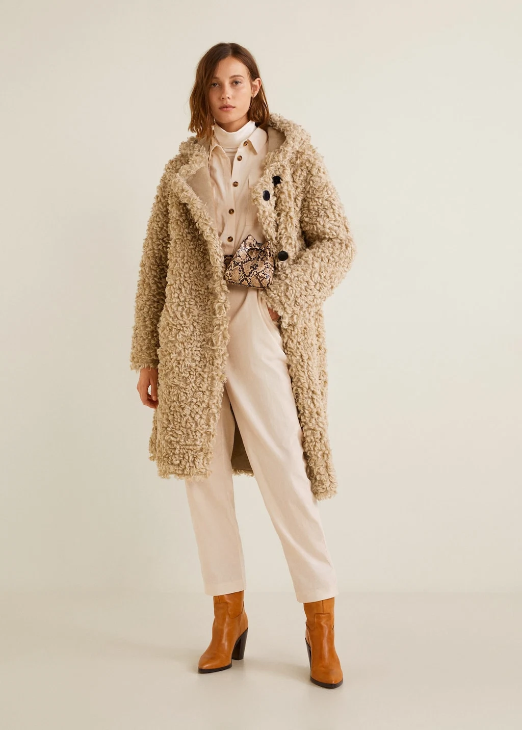 Faux shearling hooded coat, €149.99 at Mango