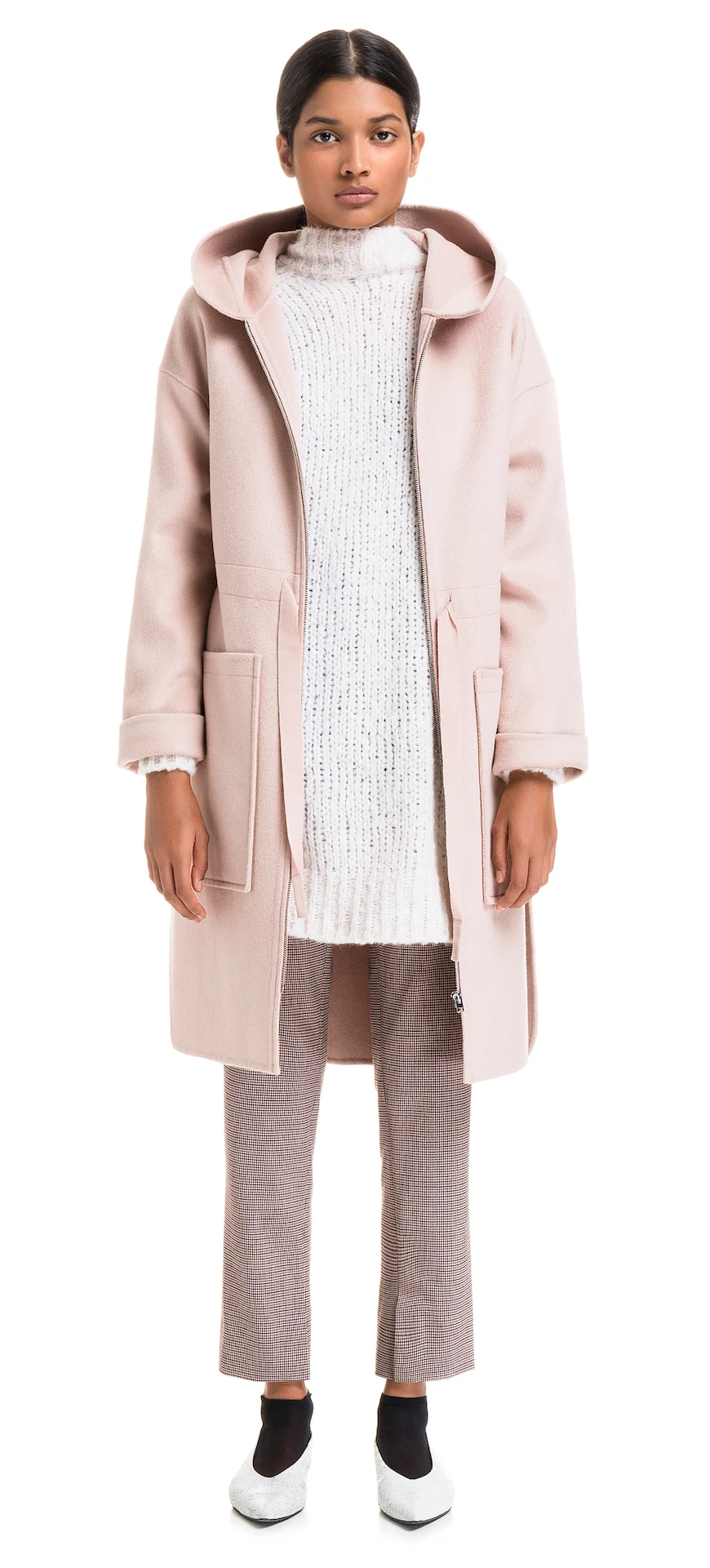 The powder pink shade of this coat looks fresh and spring-like. The hood will keep you warm and dry when the elements go against you, but on milder, brighter days it won’t look odd as it gives this coat, along with the waist-front tie, a strong athleisure feel. This brings an informality to the piece that fits with spring’s more laid-back look.