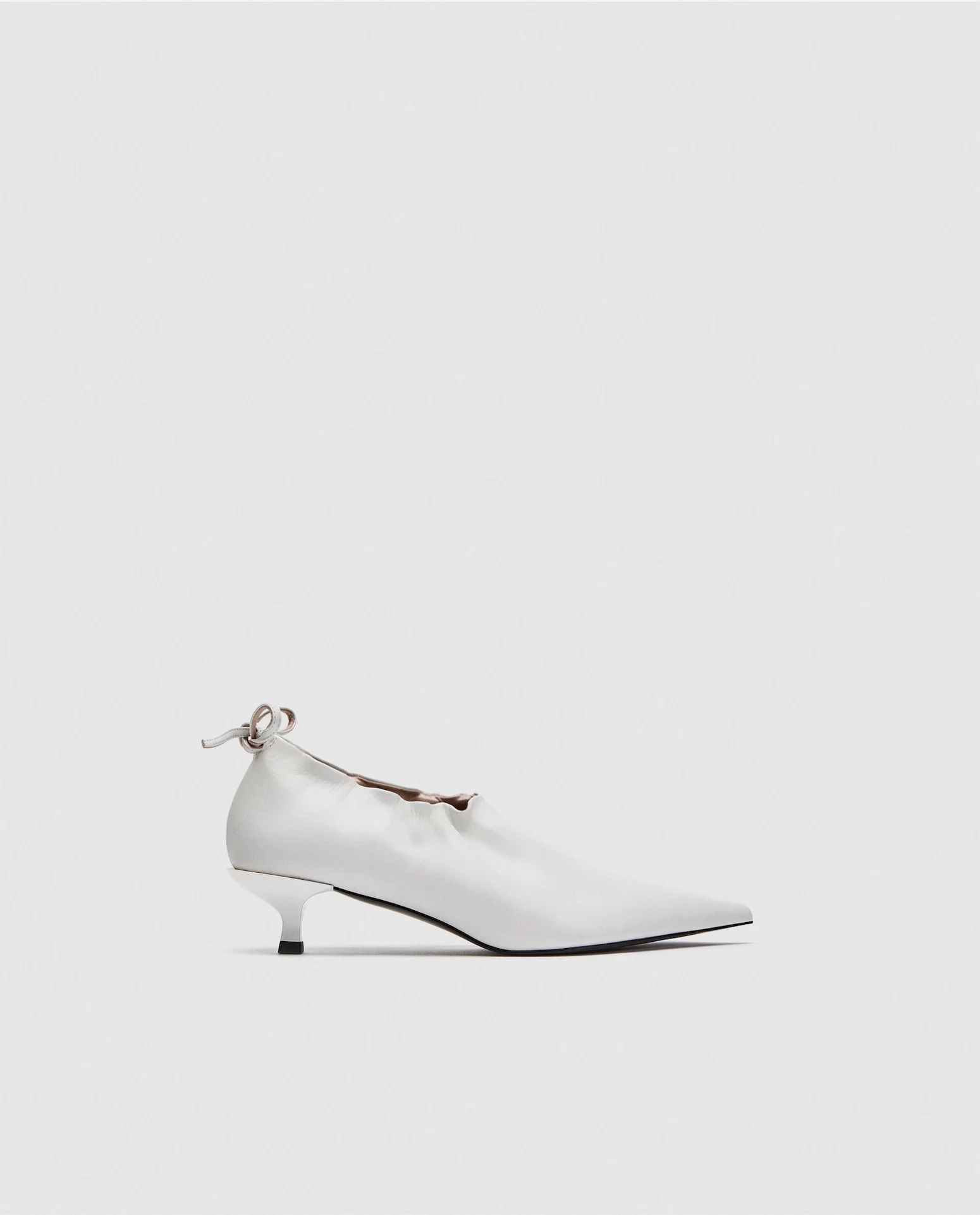 The gathered detailing gives these shoes a point of difference, while the low heel makes them a wearable choice for everyday. Pair with a cropped pant to show off the gathered rim.