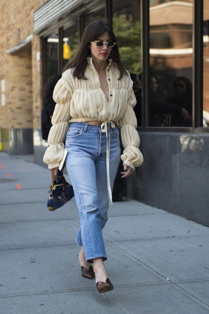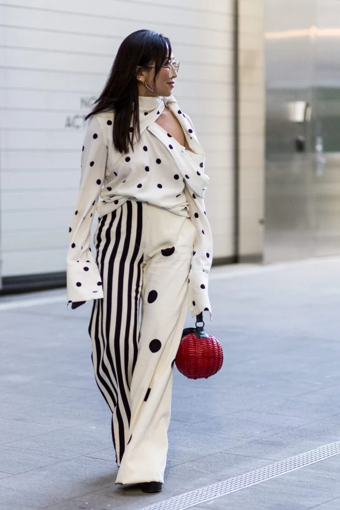 Just when you think you’ve got to grips with a trend, the fashion Gods pull the rug out from under you (or in this case the shirt off your back) and decide there’s something else you need to try asap. So forget deconstructed shirts. For summer, a ladylike blouse has the cool, sexy vibe an oversized men’s shirt used to. You’ve got to wear it with a bit of irony of course. Pairing it with a pencil skirt is missing the point. This look is all about dismantling and undermining traditional “blousy” associations; ie, prim and proper Mary Poppins. The trick is to firstly choose a blouse that inherently challenges this stereotype, such as the halter-neck style in the shot above, which reveals a hint of bra and ties at the nape of your neck (any item that ties at the back is inherently sexy). Secondly, pair it with something utilitarian or unapologetically pretty for a strong contrast and that dose of irony I mentioned earlier. Like the sound of this trend but need some inspiration? Here’s how the stars of the street are channeling the look.