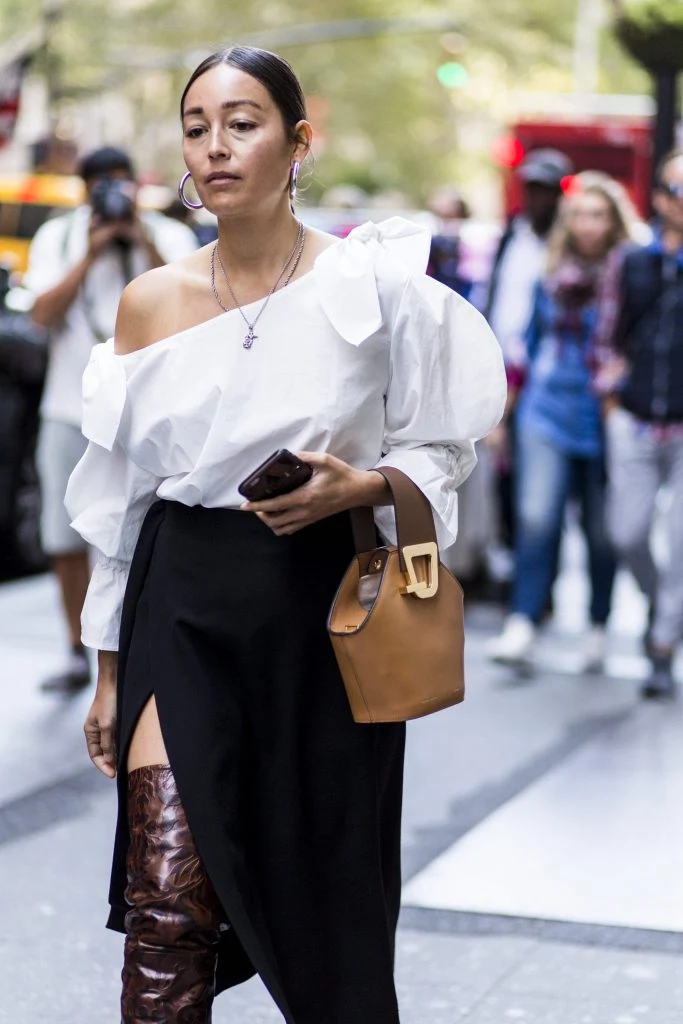A white blouse and black skirt could look so pedestrian, but this style star has injected the combination with real personality and sex appeal. A bare shoulder and a hint of leg turn up the heat, but the outfit doesn’t look cheap because of the generous proportions of the separates. Nothing is tight or looks try-hard.