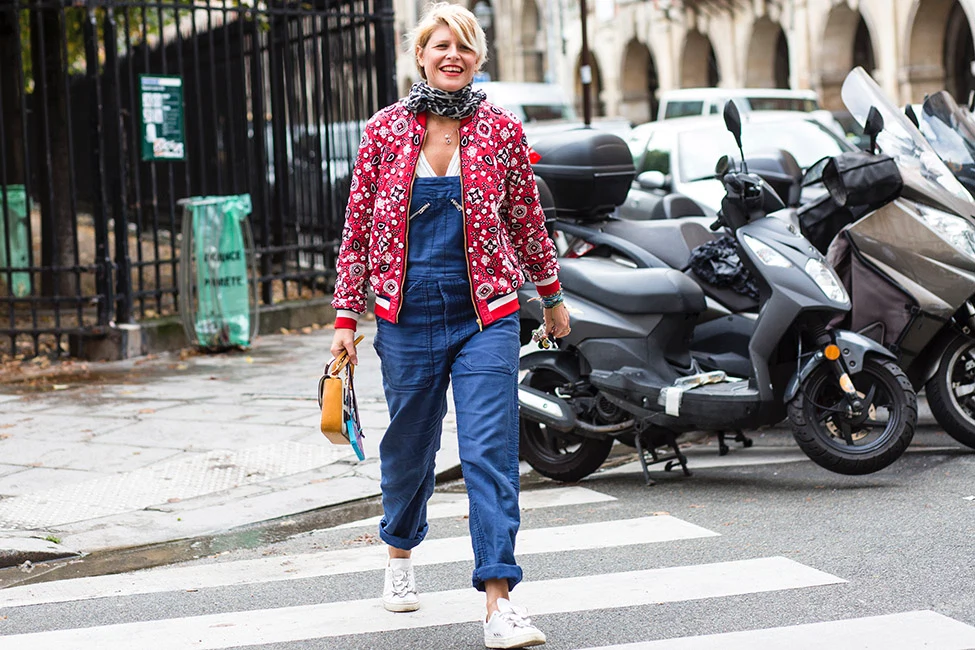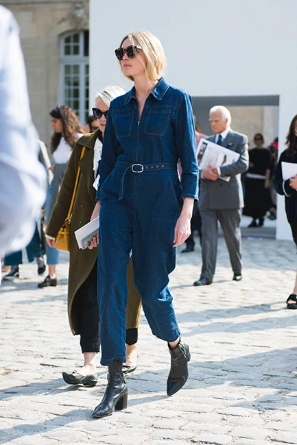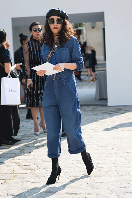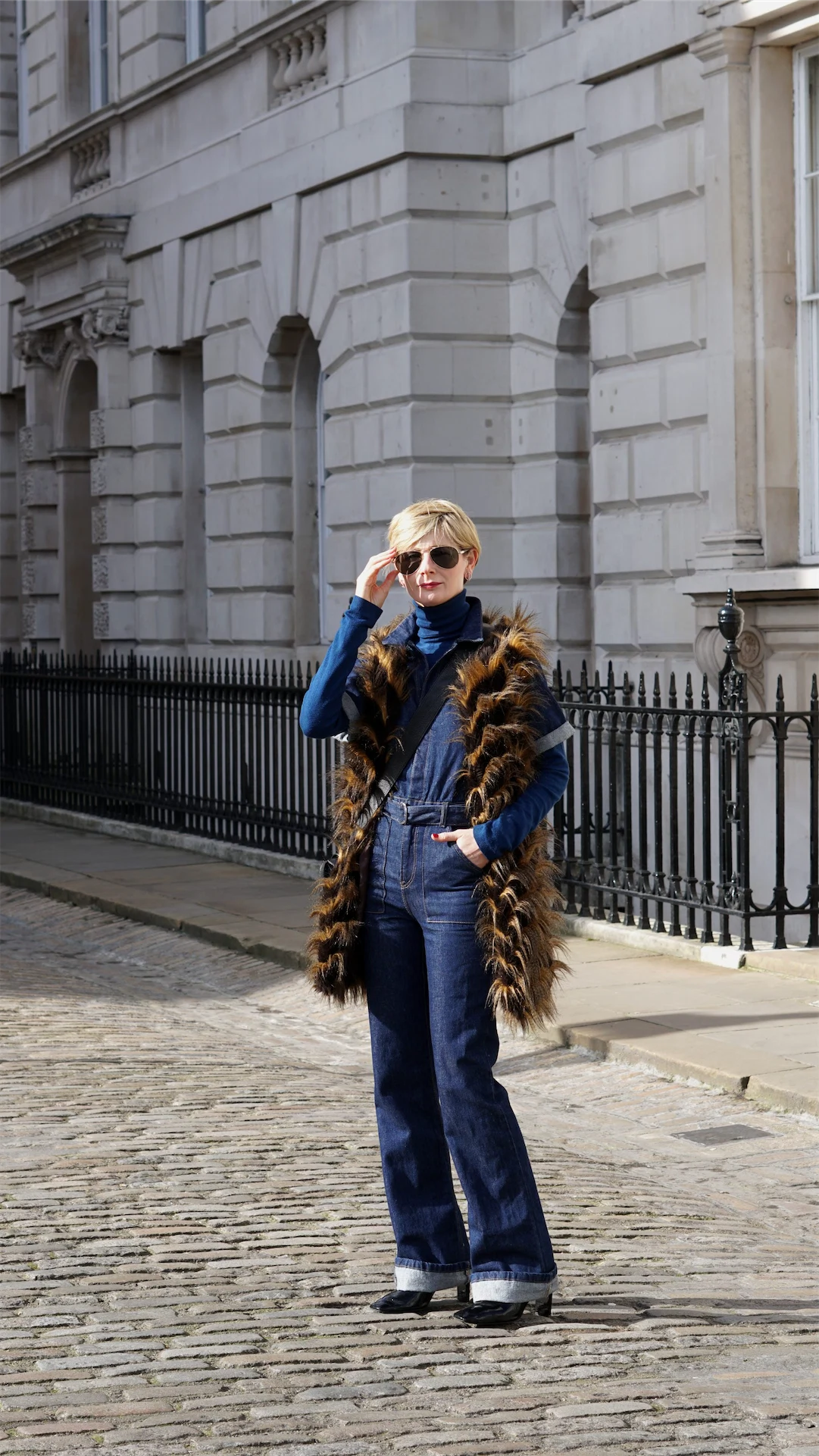 Fashion director Marie Kelly wearing a Mango denim jumpsuit at London fashion week last year.