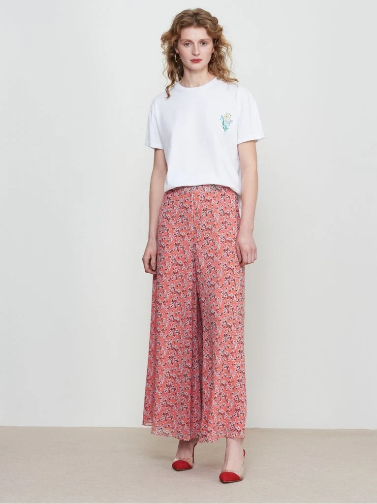 I swear by palazzo pants in summer. If you don’t want to show off your legs in shorts on a hot day, they’re a wonderful alternative as they’re so fluid and loose-fitting. This is one of the nicest prints I’ve seen this summer. A ditsy print on a wide leg works really well.