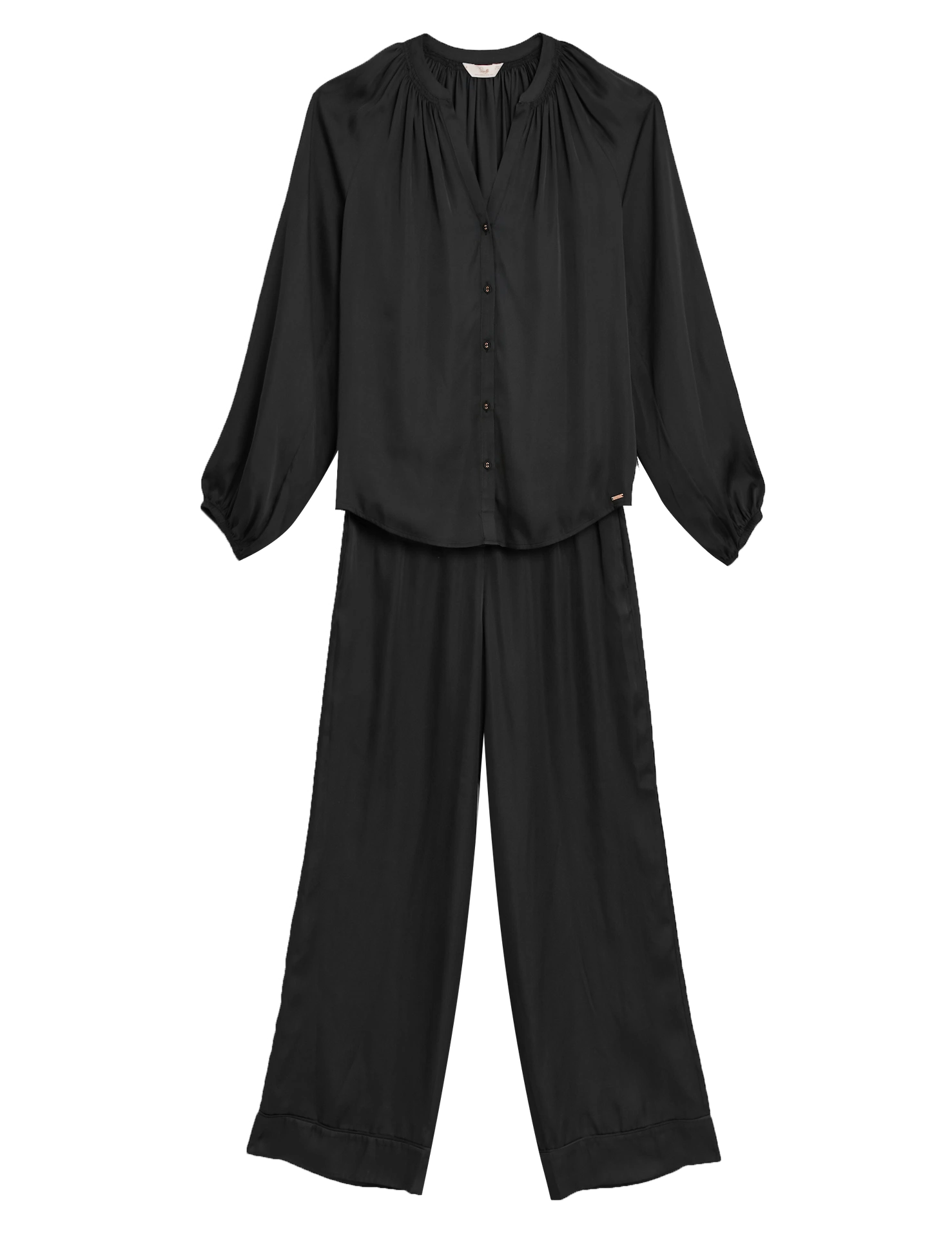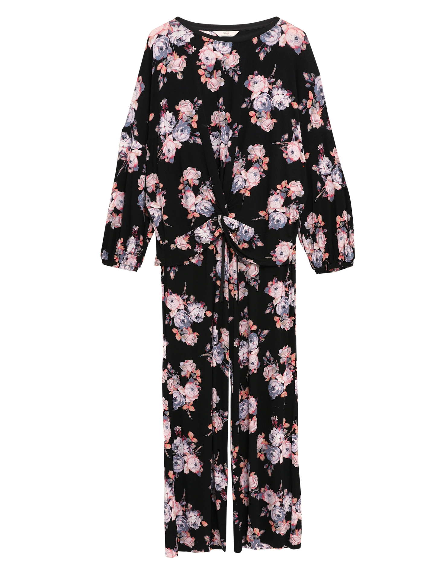 This gorgeous set features a long-sleeved top and matching bottoms, complemented by satin trims and a twist knot at the hem of the top.