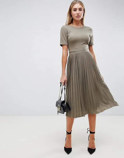 ASOS Design pleated skirt midi dress in khaki, €29.03 at Asos