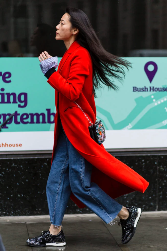 I love this look. It’s utilitarian, but glamorous too. The embroidered crossbody bag, sparkly trainers and red coat add interest to a very practical pair of jeans and a pinstriped shirt. This outfit could take you anywhere.
