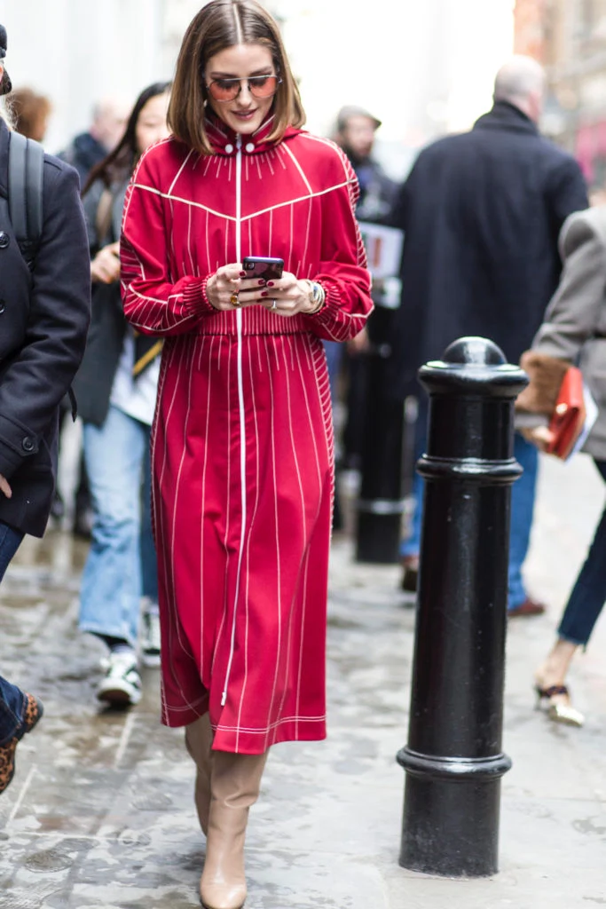 Olivia Palermo cleverly pairs raspberry with camel for a look that oozes class. Camel and red are great bedfellows, the former softening the latter and adding a timeless feel to the outfit. The dress itself has a strong athleisure hit off it, which works really well with striped print.