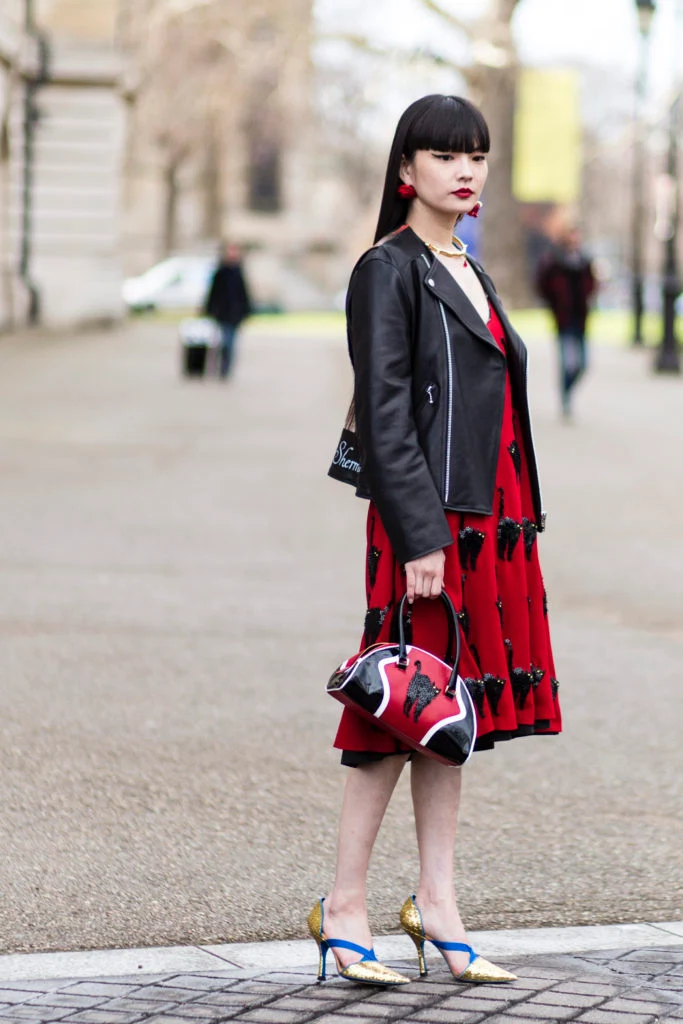 A great Christmas party outfit, this street style star has mixed black, red and gold but managed not to look like a Christmas bauble. The pop of blue in her shoes punctuates the look, while the cat motifs on her bag and dress really draw the eye. This outfit is more than the sum of its parts.