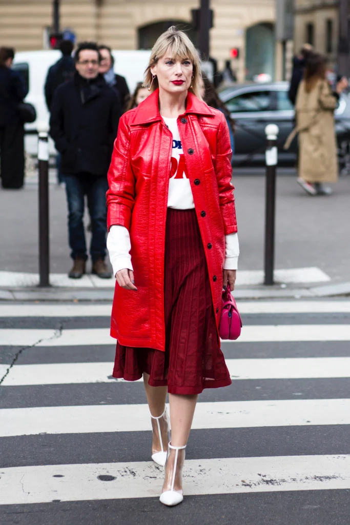 The trick to pulling off any one strong colour is to incorporate a variety of textures and shades. I love how this woman has combined three different hues – pillar box red, burgundy and raspberry – to create an outfit that has depth and personality. The pops of white lighten the look without making it unseasonal. This is clever dressing for a chic but cool look.