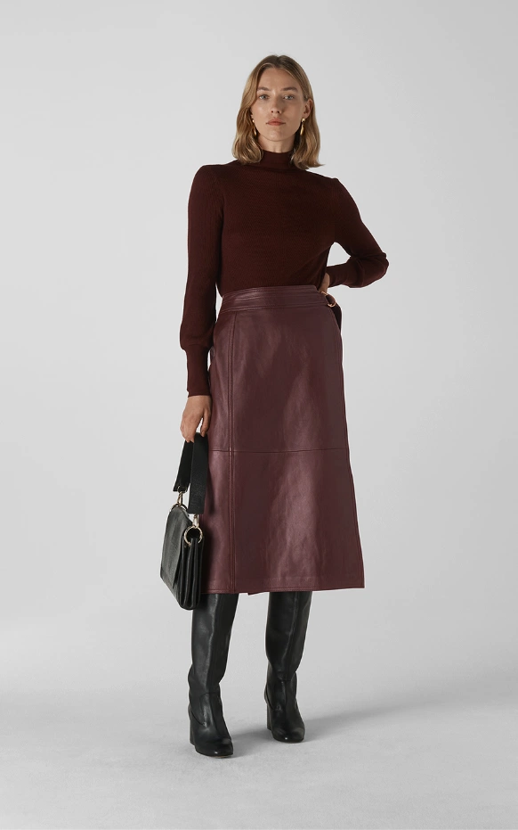 Burgundy Selina leather wrap skirt, €199 at Whistles