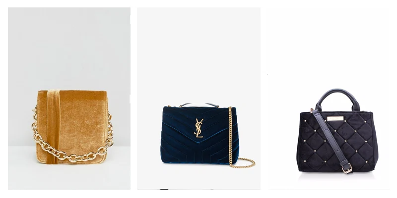 Glamorous Mustard Velvet Cross Body Bag,€47.30, at Asos; YSL Small ‘Loulou’ Monogram Velvet Shoulder Bag,€1,450 at Brownsfashion.com; Carvela Dea’ velvet mini tote,€80 at Debenhams