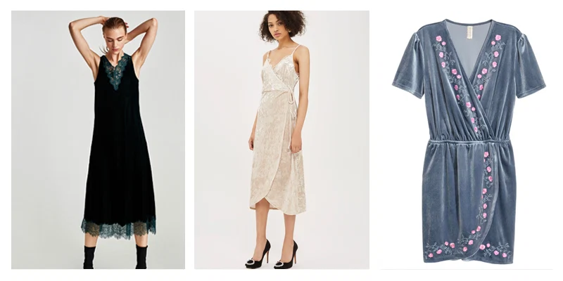 Velvet lace dress, €49.95 at Zara; velvet plunge wrap dress,€44.45 at Topshop; velour wrap dress, €27.99 at H&M