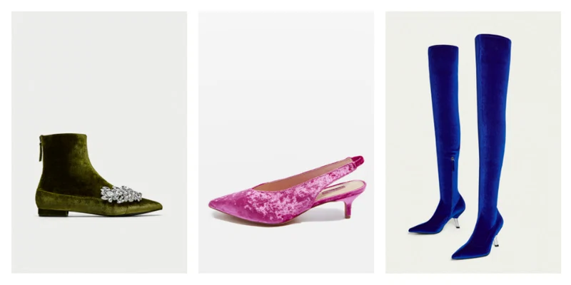 Flat velvet ankle boot with gem detail, €69.95 at Zara; kitten heel sling-backs,€44.41 at Topshop; electric blue velvet over-the-knee boots,€150 at Uterque.