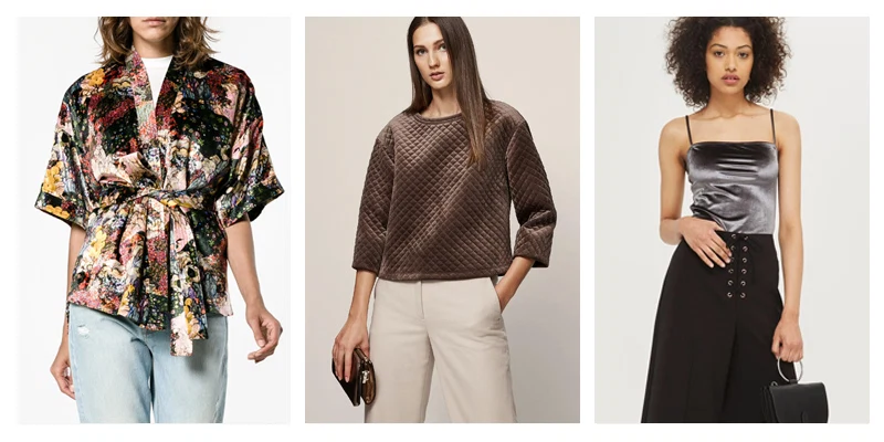 Erdem ‘Zeta’ Velvet Floral Print Kimono Jacket, €1,477.82 at Brownsfashion.com; Reiss ‘Nia’ quilted sweatshirt in bronze,€135 at Reiss.com; velvet square neck body, €21.67 at Topshop.com