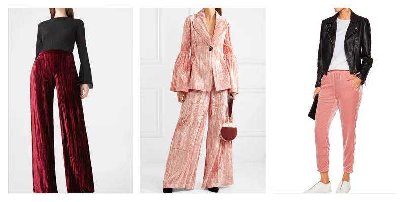 Berry velvet trouser, €35.95 at Mango; Regina Pyo ‘Beatrice’ crushed-velvet wide-leg pants,€520 at net-a-porter.com; Ganni ‘Dina’ velvet tapered pants, €81.55 at theoutnet.com