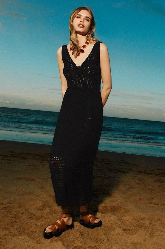 Swap out your knitted jumpers for an equally cosy, crocheted dress. The breathable material allows for both day time and night time wear (a versatility you usually wouldn’t get with a long, black dress). You can match it with strappy, leather platforms and a clunky necklace, a denim jacket and boots or a floppy hat and flip flops.