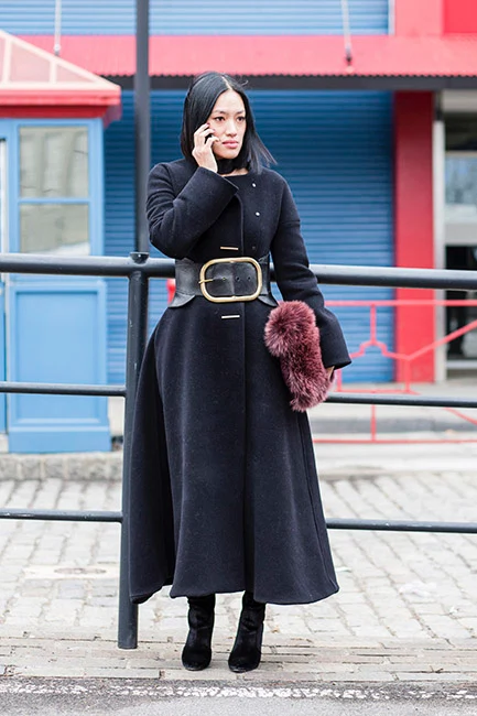 Similarly, this coat could easily look shapeless and drab, but adding a statement belt has introduced more texture and defined the wearer’s silhouette beautifully. You can get away with chunkier fabrics such as thick wools and faux fur because of the slimming, lengthening effect of black.