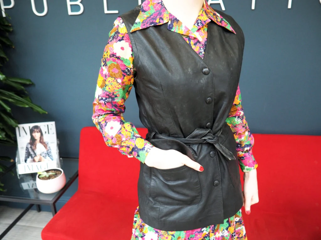 I styled it under what is probably the best value piece from my kilo sale haul — a leather waistcoat with a belt to nip in the waist. The statement collar over the black leather makes a statement, and the waistcoat is similar to a lot of pieces on the high street right now, so it’s great that I found it second-hand.
