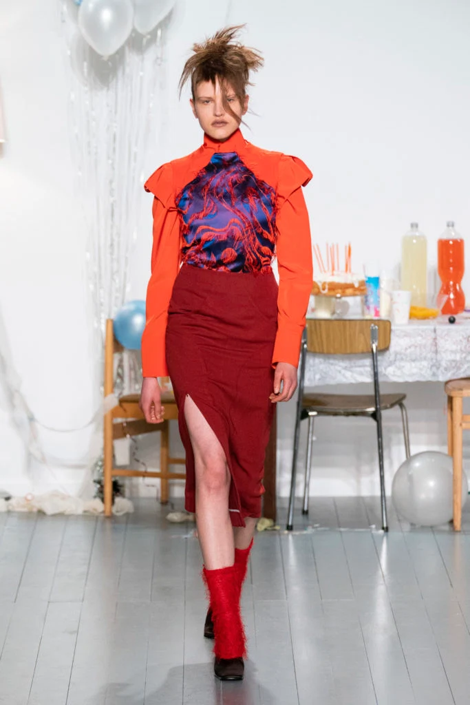 High-waisted midi-length pencil skirts with lengthy side and front splits, which gave the models a lovely freedom of movement, came in shades of claret and oxblood. Paired with Malone’s unconventional tailoring, they painted a very modern picture of this season’s bourgeois woman.