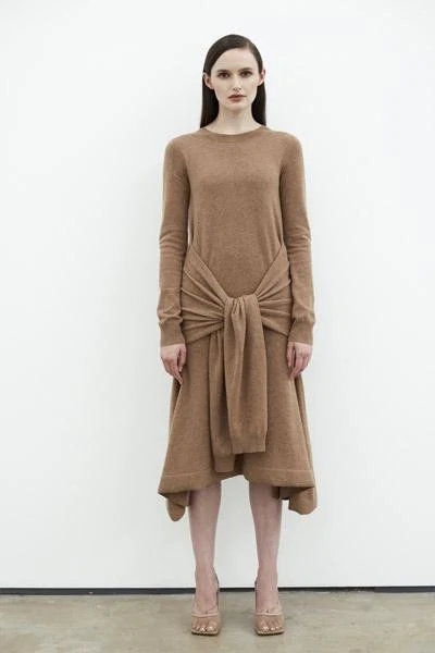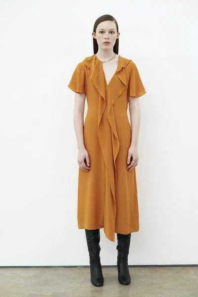 Relaxed feminine shapes are dominating dress trends this season. Thinks cinched in waists met with flowing skirts and flattering cuts. Victoria Beckham’s mustard midi dress with longline frill detail is a wonderful way to play with feminine silhouettes but still keep it office appropriate.