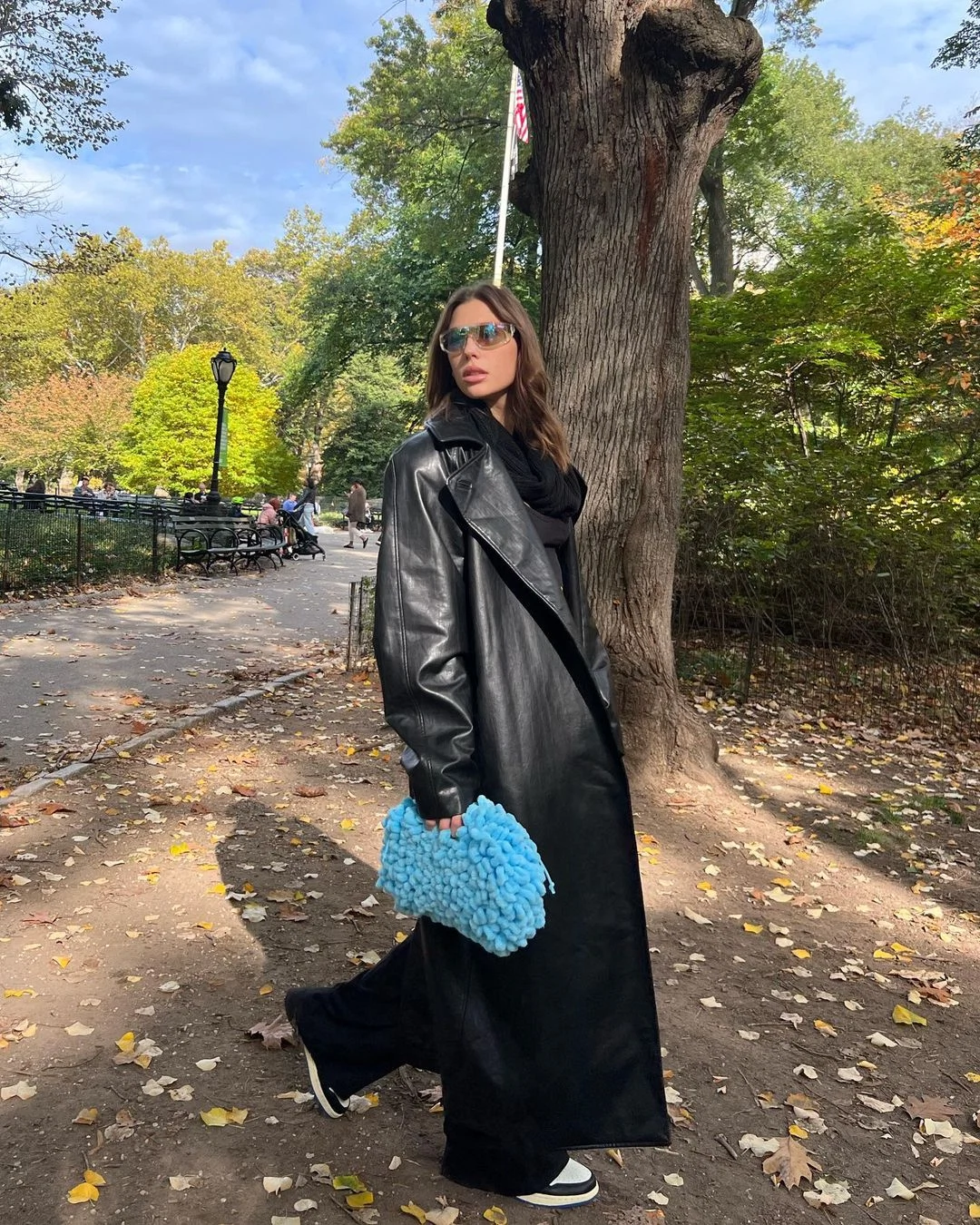 It’s my last day in the city and I’m headed on a stroll. I started my walk on Fifth Avenue and walked through Central Park, admiring the contrast of nature’s colours and the immense skyscrapers in the backdrop. As you can see, the most worn item in my wardrobe is probably the leather trench coat from my brand, Afterhours. I matched the coat with black suit pants from Afterhours, an oversized knit muffler and Nike sneakers. I love to pair monochrome outfits with a splash of colour like this Bottega Veneta blue bag.