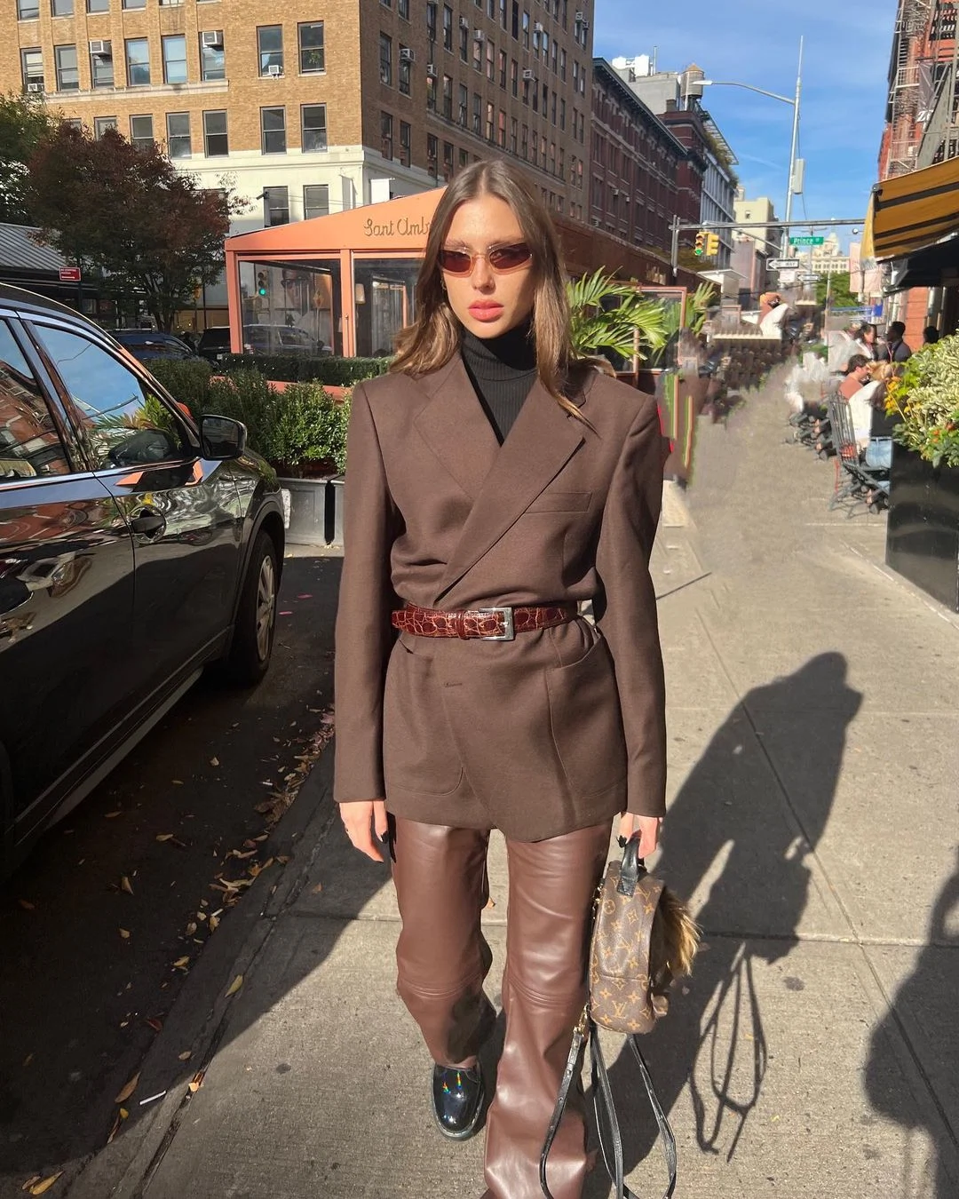 In my opinion, the most fashionable time of year is fall/winter because you can just play around and combine many different layers. A must-have piece of clothing that everyone should have in their closet is a well-tailored blazer. Today, I’m going to my favourite vintage stores in Soho where I find my most coveted items. My best vintage finds are always in NYC, like this leather belt. What better occasion for styling my chocolate brown vintage blazer than this? I paired it with leather pants, a turtleneck, Dr Martens and a timeless Louis Vuitton monogram mini backpack. Let’s go!