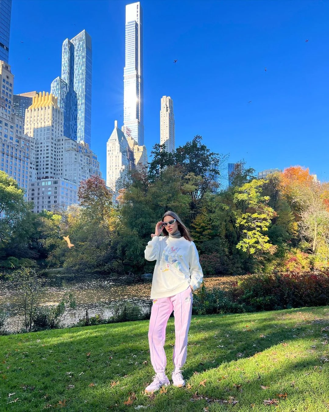 I just flew into New York from London and, as always, my first stop in this city is Central Park. To me, this is the only place in NYC where the aesthetic changes drastically between the seasons. Usually, I like to travel in comfy sports clothes and this time I chose to pair a Casablanca sweatshirt with Fiorucci lilac sweatpants and Adidas sneakers. There’s nothing worse than catching a cold on a flight, so I layered my outfit with a cashmere sweater from Ralph Lauren underneath. It’s an item I swear by when travelling.