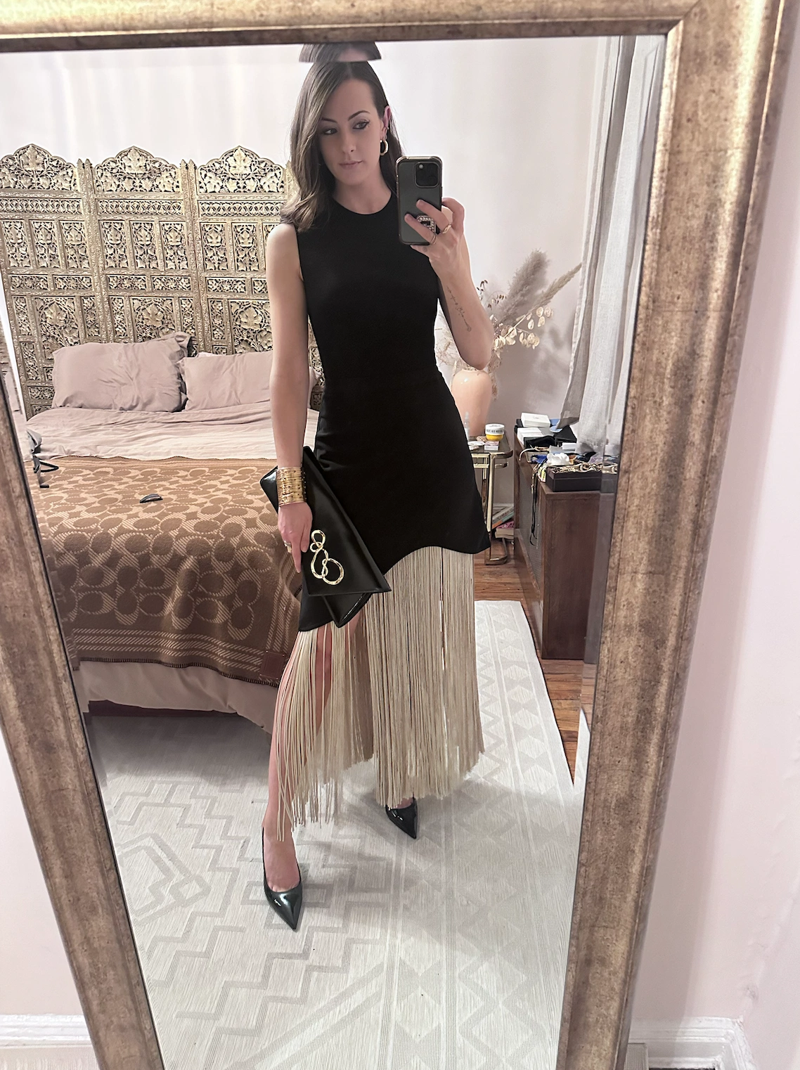 I’m buzzing for Saturday night of NYFW (the PatBo show and a Gucci party in Soho) after my first cover as Maxim’s contributing fashion editor came out this afternoon, starring our one-and-only national treasure, Maura Higgins! Time to celebrate. This dress from Michelle Ochs’ debut collection for Hervé Leger just came in during the week and I’ve been dying to wear it. I’ve been really loving incorporating fringe detailing since being bombarded with it on all of the gorgeous runways last season in Milan. I’m teaming the dress with a black and gold envelope clutch from Alexis Bittar, needle-thin slingbacks from Paris Texas, and a cuff from Zara.