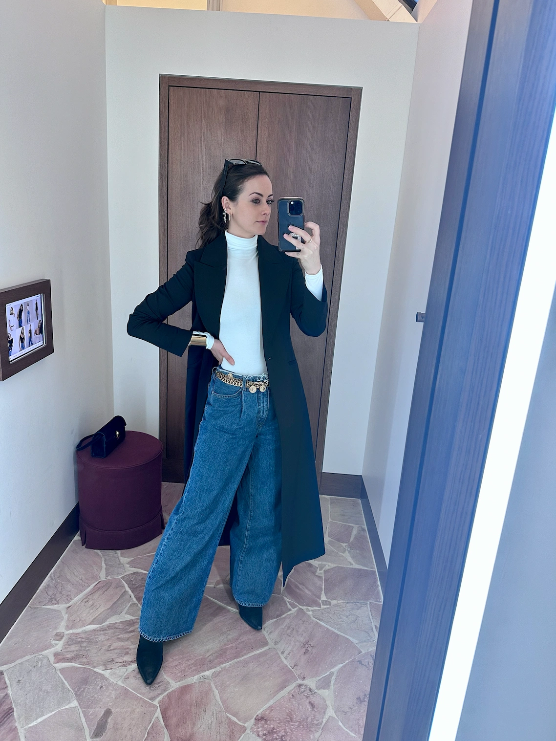 For a preview of the new Bronx & Banco collection with the designer, Natalie, and a few last-minute showroom visits in Soho, being comfortable but sharp is key. I love the length of this Alice & Olivia coat, which elevates my go-to, easy-peasy daytime uniform of a bodysuit (in this case, Wolford) and high-waisted wide-leg jeans (SLVERLAKE). Like Austin Powers’ Goldmember, I love gold, so you’ll usually find a Mr T-worthy piece or two in my outfits. This Lafayette 148 cuff, Zara chain belt, and black suede bag with gold hardware from Savette NY typically get a lot of outings.