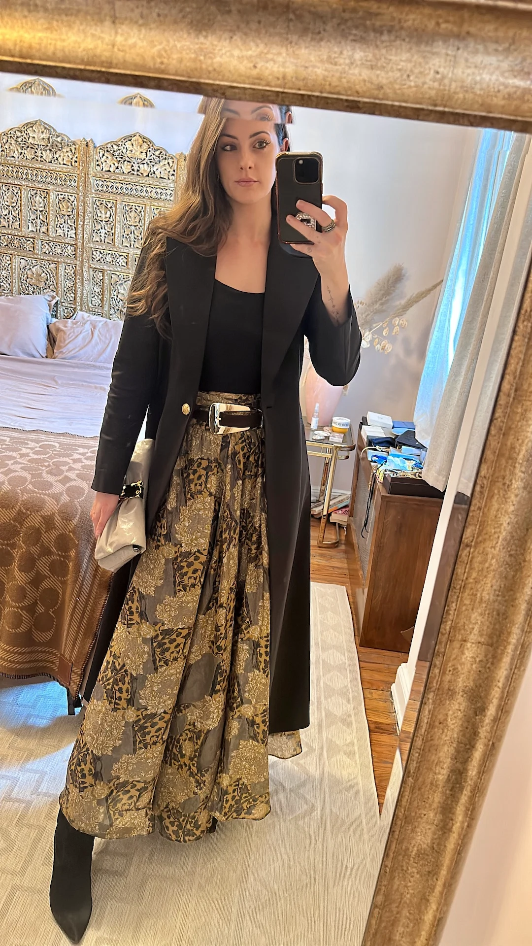 Dinner with Neiman Marcus and House of Creed to celebrate their newest fragrance, Queen of Silk. Speaking of silk, at some point, I saw a gorgeous silky halter neck top with a rosette at the neckline and as much as I immediately wanted it; I couldn’t justify the price. Voilà, I found this H&M zebra number for $15.99 and figured I could cinch the neckline with a floral choker I had lying around. I’ve literally worn these black trousers from the Canadian brand Aritzia to several raves *and* several first dates: there’s little they can’t do! A black suede low-heel cowboy boot from Larroudè, a chunky gold bangle by Alexis Bittar, trusty Sauvette NY bag, and I’m good to go.