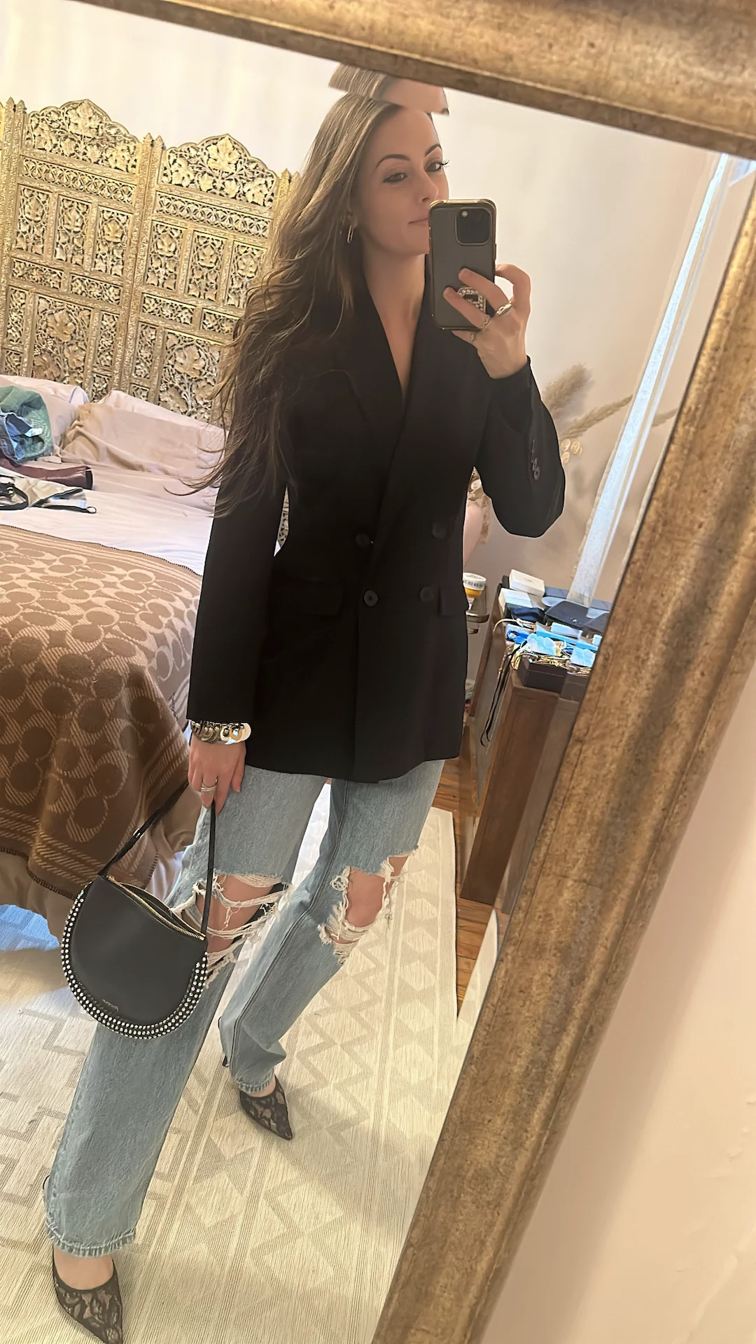 Today’s agenda includes an early morning presentation for the brand Kallmeyer (one to watch, for sure; the chicest New Yorkers are all fawning over this label), and shows for Naeem Khan, Coach, Retrofete, Sergio Hudson, Tory Burch, and LaQuan Smith, as well as a cocktail party the magazine I work for is hosting. I’ve totally forgotten I’m supposed to be documenting my outfits in the relentless schedule of today – alas, here’s a blurry pic I scrambled to take during a quick break at home in the evening. The chaos on my bed is an analogy for what’s going on inside my brain at this point. Back to the rule of contrasts… I really dig the ripped jean (American Eagle; highly recommended for my fellow pear-shaped folks) with the formality of a double-breasted blazer (this one is by Rebecca Vallance) and these chic lace mules by Loeffler Randall. A bit of bling for a Monday? Why not. I’ve called it in thanks to this JW Anderson ‘Bumper’ bag and a bangle from the recent H&M x Rabanne collab.
