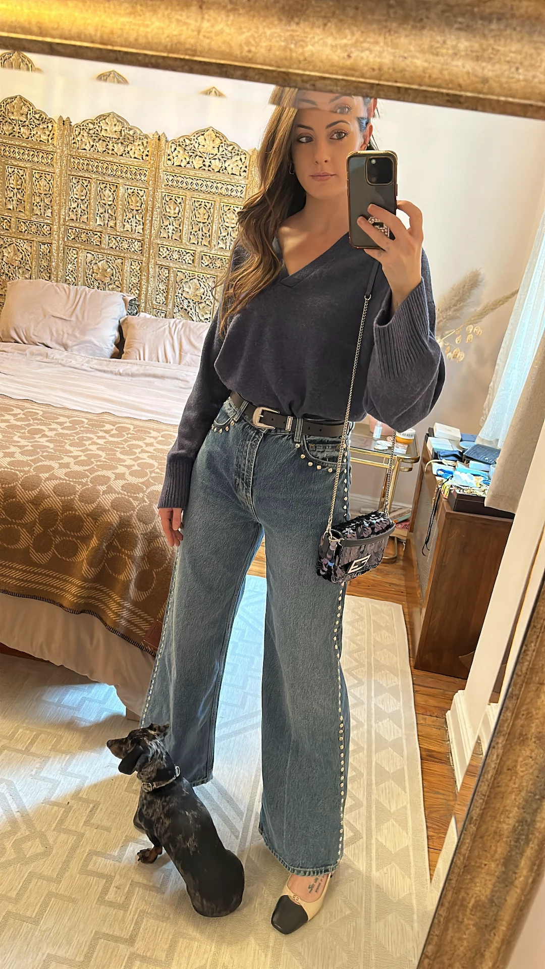 Slightly recharged after a good night’s sleep and an early morning Barry’s Bootcamp class with one of my best friends who’s in town from LA! Still, I’m not gonna run before I can walk today (I already did my treadmill sprints, after all) so I’m going to opt for comfort for the first half of the day as I’ve three shows to get to on foot – Cucculelli Shaheen, LAPOINTE, and Alice & Olivia. I love the stud details on these Reformation jeans, and this cosy Reformation knit polo in calming blue is just what I need. I like to have contrasting elements in all my outfits, which is how I landed on breaking up the very feminine Fendi bag and Chanel-esque Sam Edelman two-tone slingbacks with a tougher Western buckle belt from Artizia that nods to the silver studs on the pants.