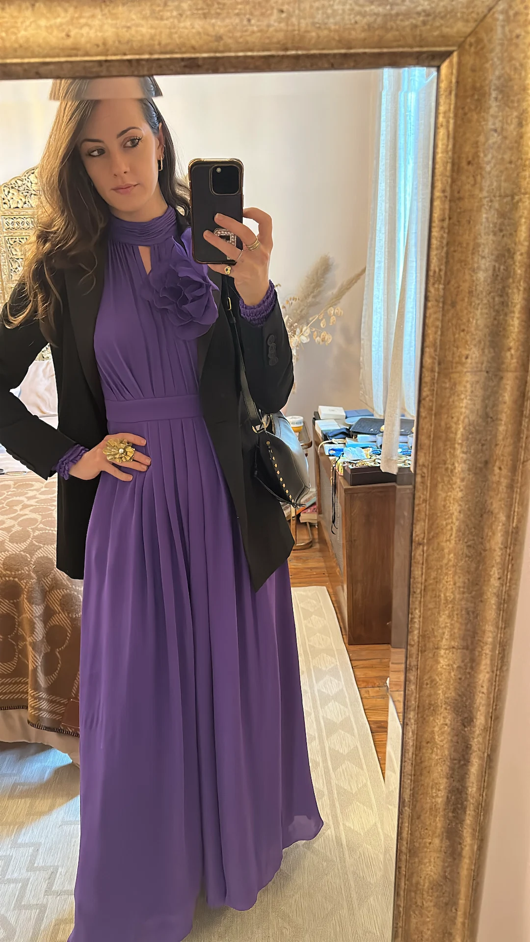 It’s Super Bowl Sunday… but more importantly, the Ulla Johnson show is scheduled for 10am at a hard-to-reach venue in Brooklyn. We all have our sports! I’d been thinking about this ME+EM dress since a preview last autumn – I mean, that regal Cadbury’s purple hue! The rosette detail! I love nothing more than an ultra-feminine dress, but I like to tone things down with other elements of the look. Ergo, an All Saints tuxedo blazer, a studded Isabel Marant bag, and you better believe there’s a cowboy boot under there as always. My ring is from a Ulla Johnson sample sale many years ago. Gotta support! This outfit will also see me through the Rosetta Getty presentation, the Jason Wu show, Kobi Halperin show, a Ganni x Mejuri cocktail party, and the Christian Cowan show uptown. By the time the Super Bowl actually rolls around, I’m, rightfully, in my pyjamas. There’s always next year!