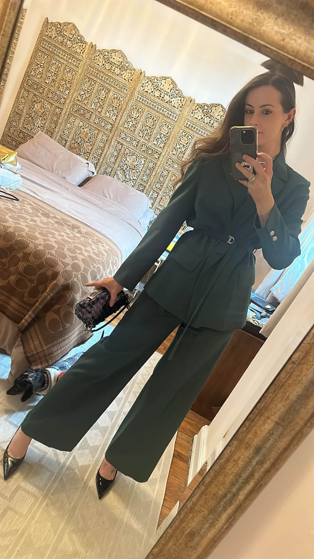 The madness is beginning! Ahead of the official kickoff of New York Fashion Week tomorrow, there’s a L’Agence presentation at Gotham Hall, Christian Siriano is hosting a runway show at The Plaza, I’ll pop to a party that the footwear brand Alexandre Birman is throwing, and then Puma will take over the Park Avenue Armory for a big-budget spectacle. If my energy is dipping, a chic suit will usually put a pep in my step. I’m very into the Slytherin green of this Maje set, and clearly, the star of the show here (apart from my dachshund, gorgeous George, peeking out) is this navy sequin Fendi Baguette that is, sadly, just on loan for a few days thanks to the website Fashionphile. My two necklaces are from the brands Dorsey and Miraco, and if anyone is looking for a great cocktail ring for less than €100, I really vouch for this sparkly Daphine London one.