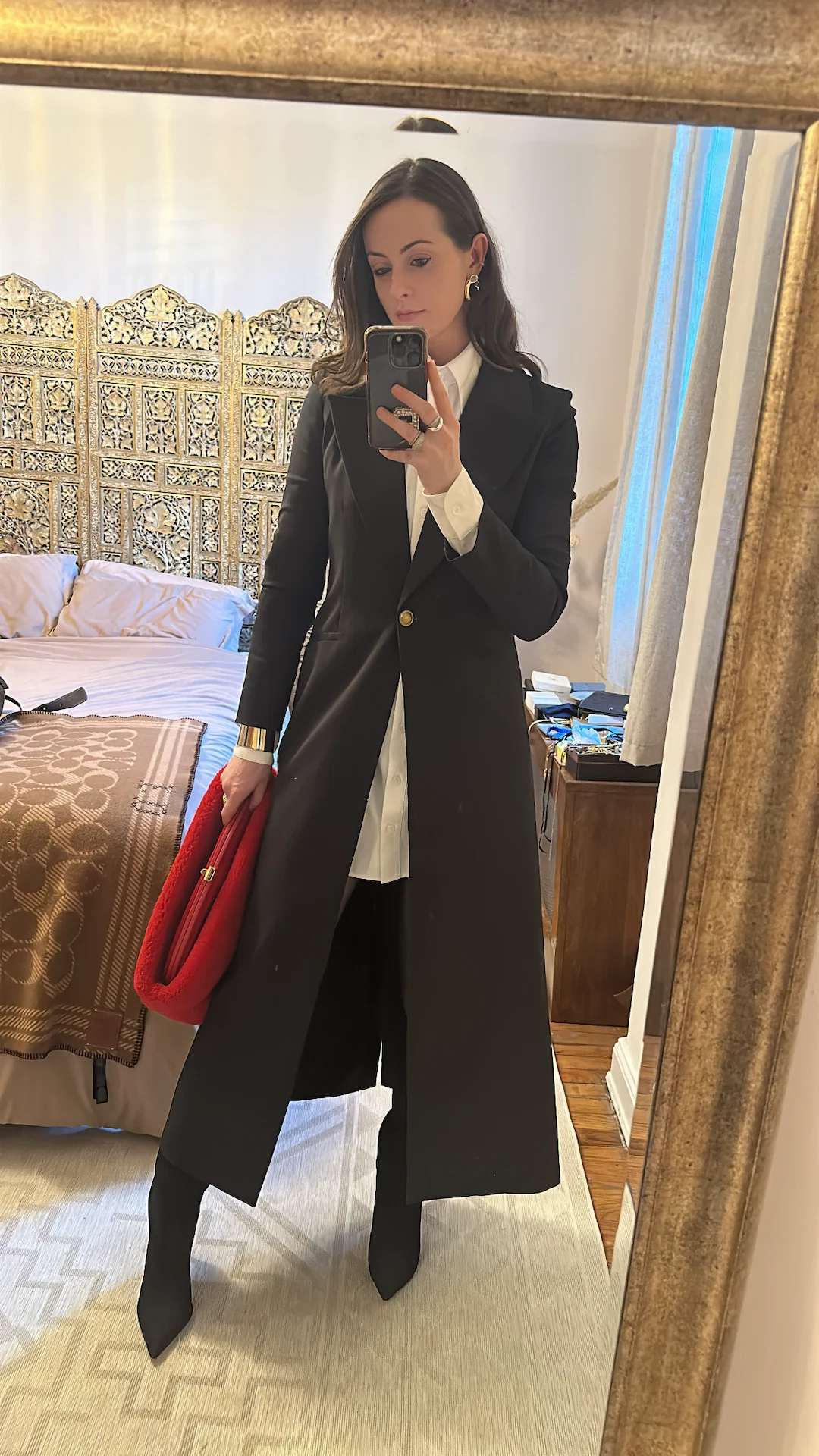 Happy Valentine’s Day lovers, and cheers to the last day of the NYFW obstacle course! Some of the shows I’ve been most excited for are happening today: Brandon Maxwell, Thom Browne, Alejandra Alonso Rojas, and Bevza. Plus, I know I’m finally going to break dry January with a well-deserved glass of wine tonight. One would have to include a bit of red in the outfit to celebrate, no? At this point, I’m hanging on by a thread so we go back to that tried-and-true formula of black and white. The MVP Alice & Olivia coat is broken out again, layered over this She Wolf shirt dress from Grover Rad (a really interesting and thought-provoking socially-conscious LA-based brand), perfectly-opaque 10 denier tights from Wolford (if you know, you know), knee-high suede boots from Schutz, earrings from Alexis Bittar, gold cuff from Lafayette 148, and my favourite conversation-starting red fuzzy clutch from Mark Cross. You best believe I’ll be cuddling into it as a pillow after that glass of wine hits!