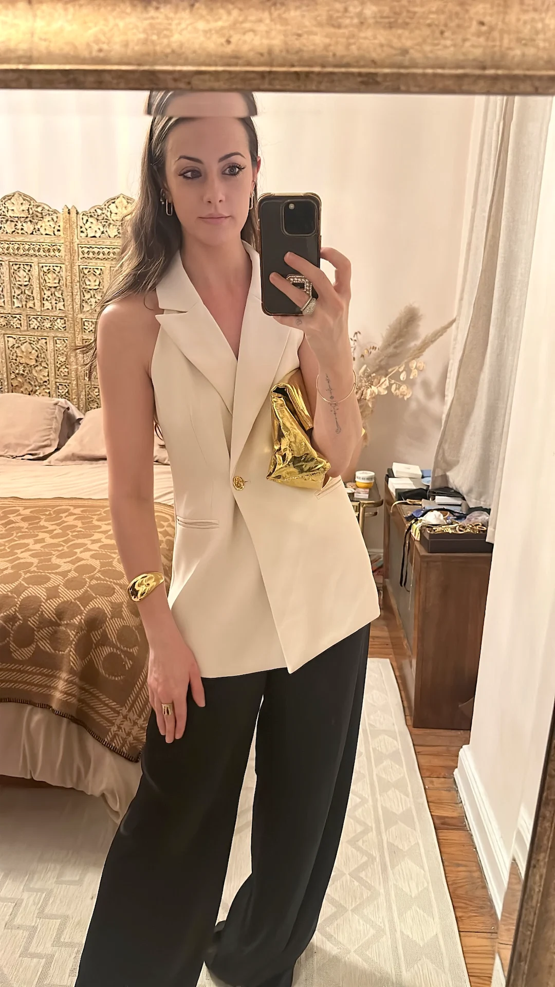 Dinner time! I have an evening ahead with Pandora, where I’ll also be interviewing new campaign faces Halle and Chloe Bailey, so I want something simple and stylish that makes me feel pulled together – a take on black and white tuxedo dressing always fits the bill for this mission. This waistcoat is from French Connection (I love the oversized gold button – very Jil Sander on a budget), and my silk black pants are super old from Express. Again, gold will usually come into the mix, and I adore this cuff from Brilliant Earth and Haute take on a foil lunch bag by Dries Van Noten.