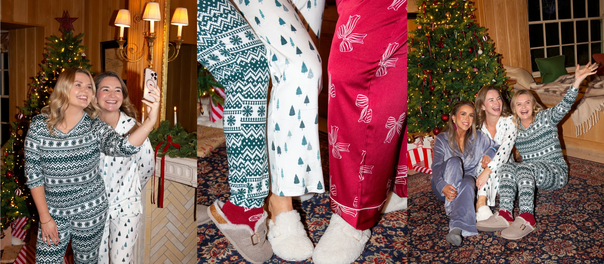 Lizzie snuggled up in winter tree pyjama set, taking a selfie with Dominique who wore a long-sleeved, cuffed set in a fair isle print.