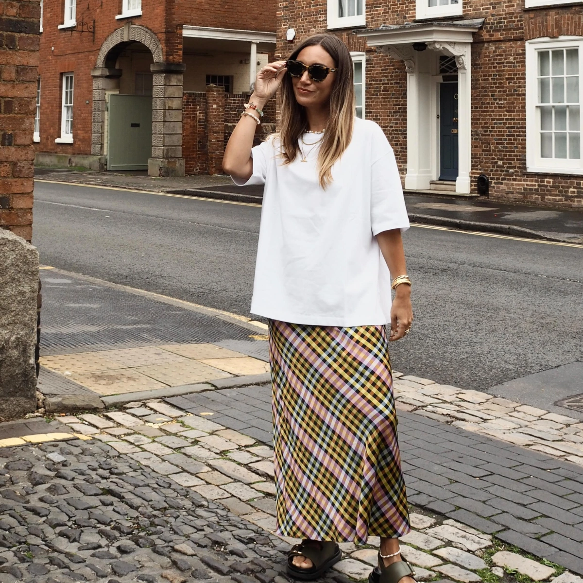 If there’s one person who knows how to style an oversized tee, it’s Nathalie Nina – the undeniable queen of comfortable yet chic. Here she teams a boxy white top with a colourful slip dress and some sandals. Some gold jewellery and a pair of sunnies complete the look. Throw on a blazer if you’re heading into the office or a cropped denim jacket for gallivanting around town.