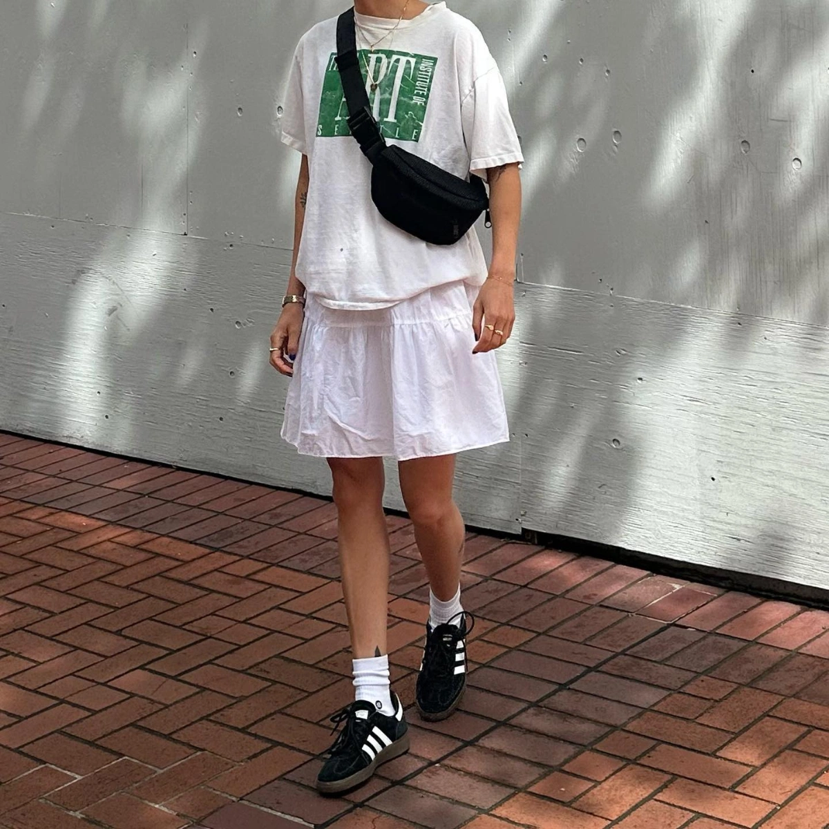 Tiered white skirts and Adidas trainers; both bang on trend… wear them together and you’ve got the easiest, no-fuss end of summer ‘fit. Add a Uniqlo crossbody bag if you really want to tick all the Cool Girl boxes.
