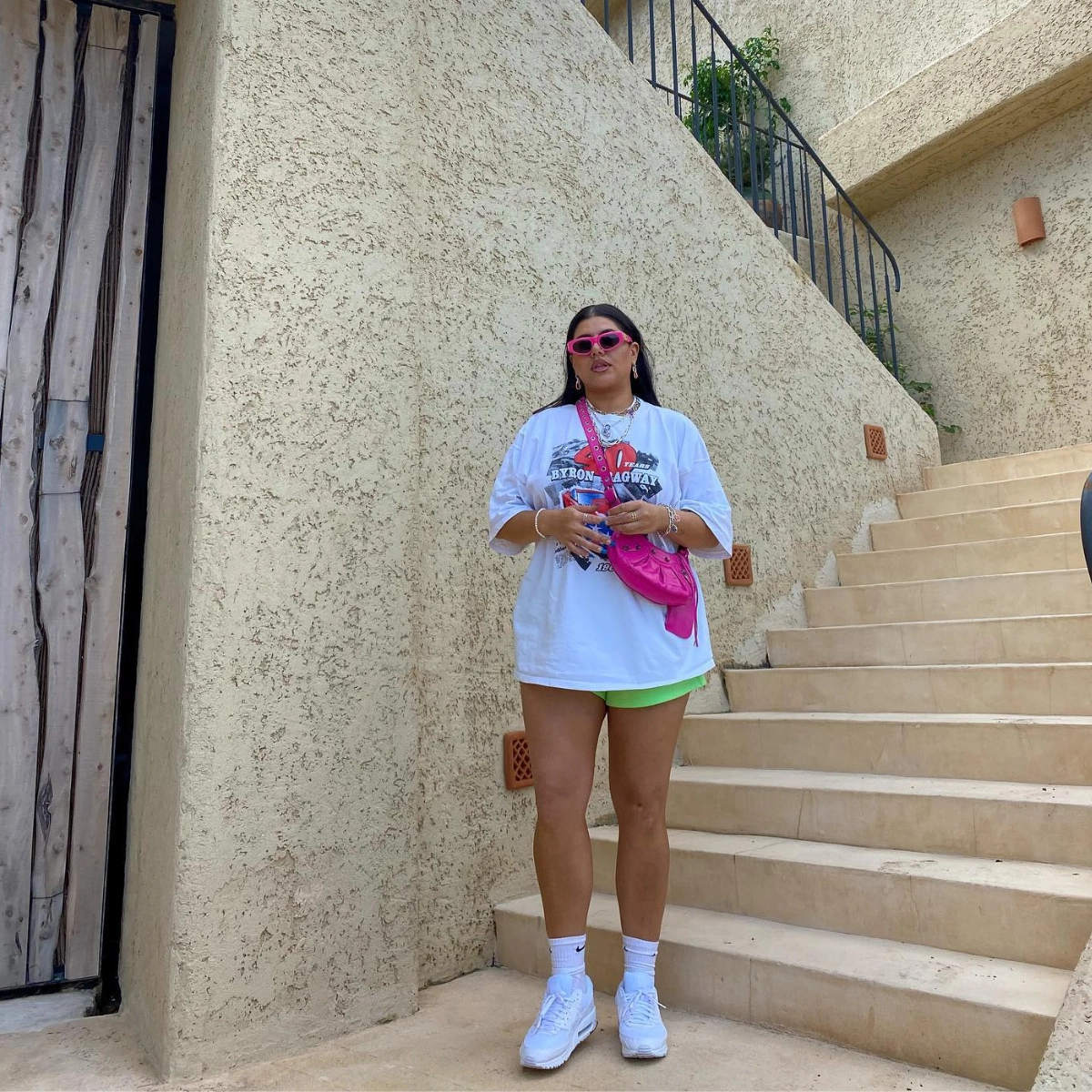An oversized tee and a pair of short shorts make for the perfect pairing. Follow Tara Kumar’s lead and opt for a white top with something colourful layered underneath – the playful peek of neon is fun and summery all in one.