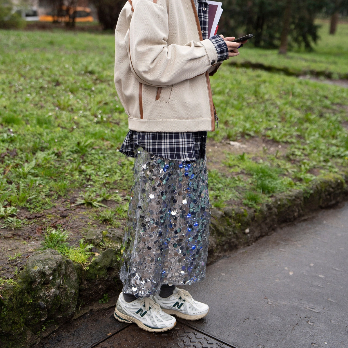 When it comes to wearing sequin skirts, or any kind of sequins in fact, I find that shoes matter, especially if you’re not opting to wear one for a typical sparkle-required occasion. I love to contrast mine against a kitten heel worn with wool socks almost pooling at the ankle for a further play with a difference of textures. It’s that play with contrast that brings sequins into a stylish street-style-approved territory. Or pair with a sturdy loafer or trainers and you’ve got a covetable daytime look that nods to the trend in a cool and sophisticated way. And if you end up unexpectedly revelling into the evening, you’ll be ready.