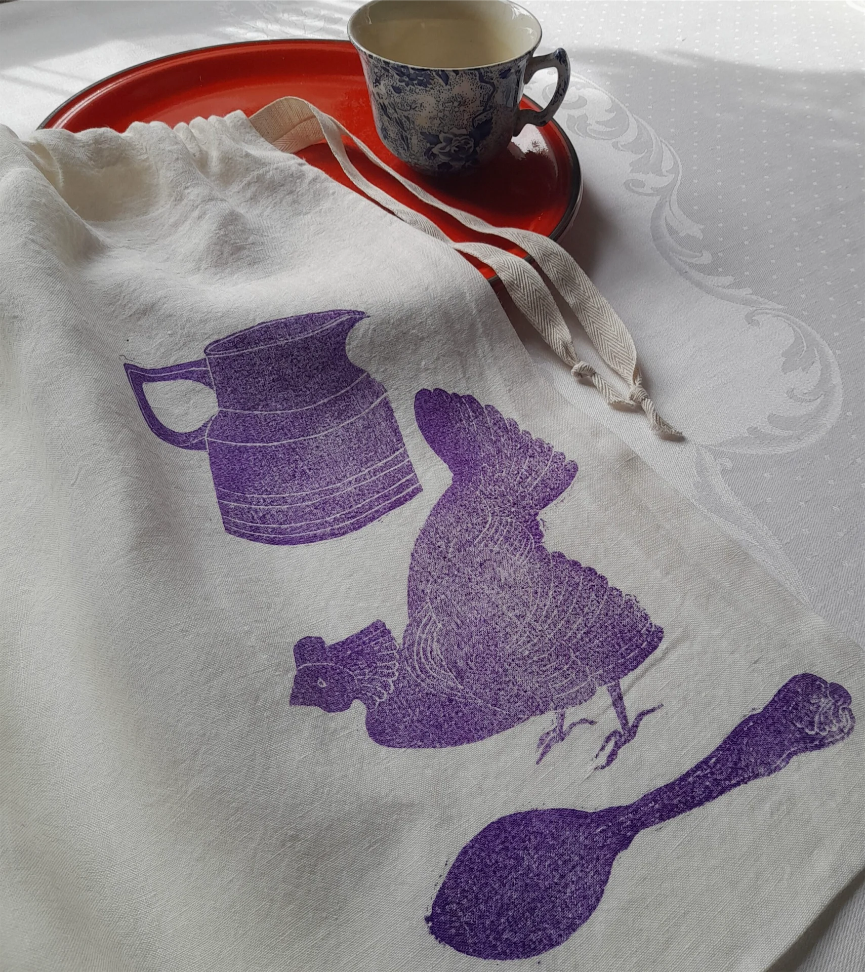 I design and make two bespoke collections of hand-printed pieces. Hearts of Ireland is a unique collection of hand-printed cards, prints and notebooks. Home from Home is a bespoke collection of hand-printed 100% Irish linen napkins, bread bags, tea towels and oversized linen bags. The designs are brought together to create a collection of work that celebrates all that is authentically Irish. Sustainability and zero waste are central to my practice, in both design and materials.