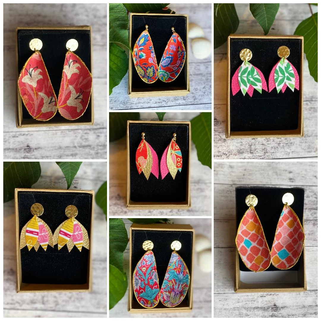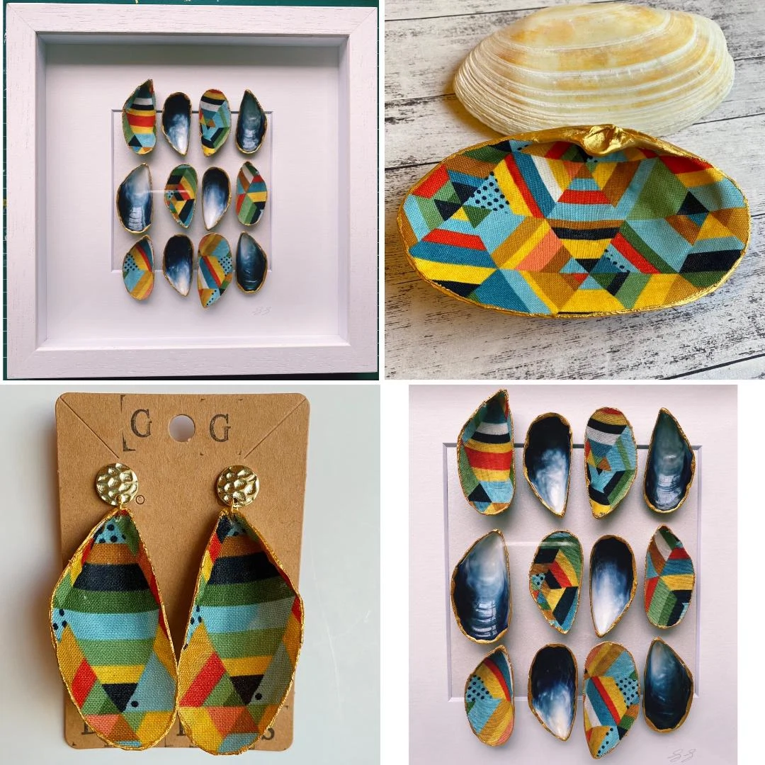 I stock a wide selection of earrings, the most popular being my mussel shell and fabric collection. Recently I have started making necklaces and brooches using leather cut-offs. I also make trinket dishes using Irish scallop shells and bright vibrant fabrics and finally my collection of framed shell art.