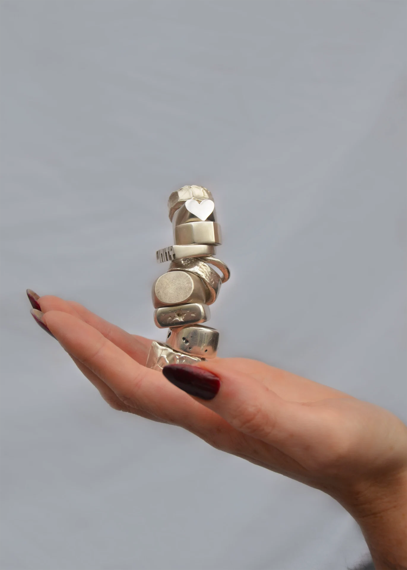 My name is Rohmie Jade, I am a multidisciplinary Irish designer, self-taught jeweller and pole dancer. For the past three years, I have been living in Spain and working remotely. This February I moved home to Ireland, quit my job as a graphic designer and officially set up RJADED Jewellery. Now, I spend my time creating statement, genderless, silver pieces for everyday wear. I design everything myself in a small studio that I set up outside my parents’ home in Clare. Everything is handmade and sustainable. A lot of my work is inspired by Irish culture. I incorporate storytelling into each piece I make by engraving either colloquial expressions or words onto their surfaces… that may be the graphic designer in me, still wanting to express my ideas through a combination of type and form! My other work is focused on exaggerating certain textures in the metal, like a melted or aged effect, for example.