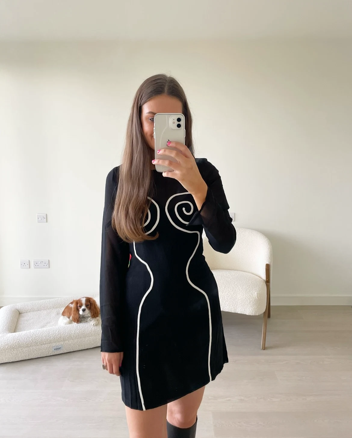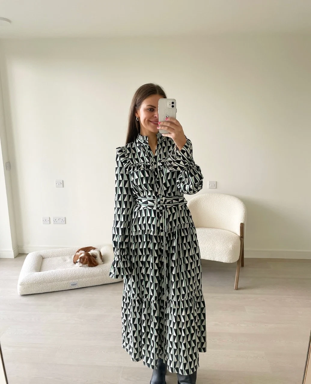 Tuesday, I venture into the office in town. I am wearing a Kitri Studio tile print dress. I have a lot of Kitri dresses in this shape and find them amazing as they are so easy to wear. This dress is vintage inspired yet feels very timeless! I love its billowy sleeves. They’re real “throw on and go” pieces. I feel this dress nails a smart casual office dress code. I usually pair it with black knee-high boots but I also wear it going into spring with trainers. I like to think about my cost per wear when I am shopping, – something like this dress is a good example of a piece I will wear a lot and feel confident in, so I know it is a good investment at the time of purchase.
