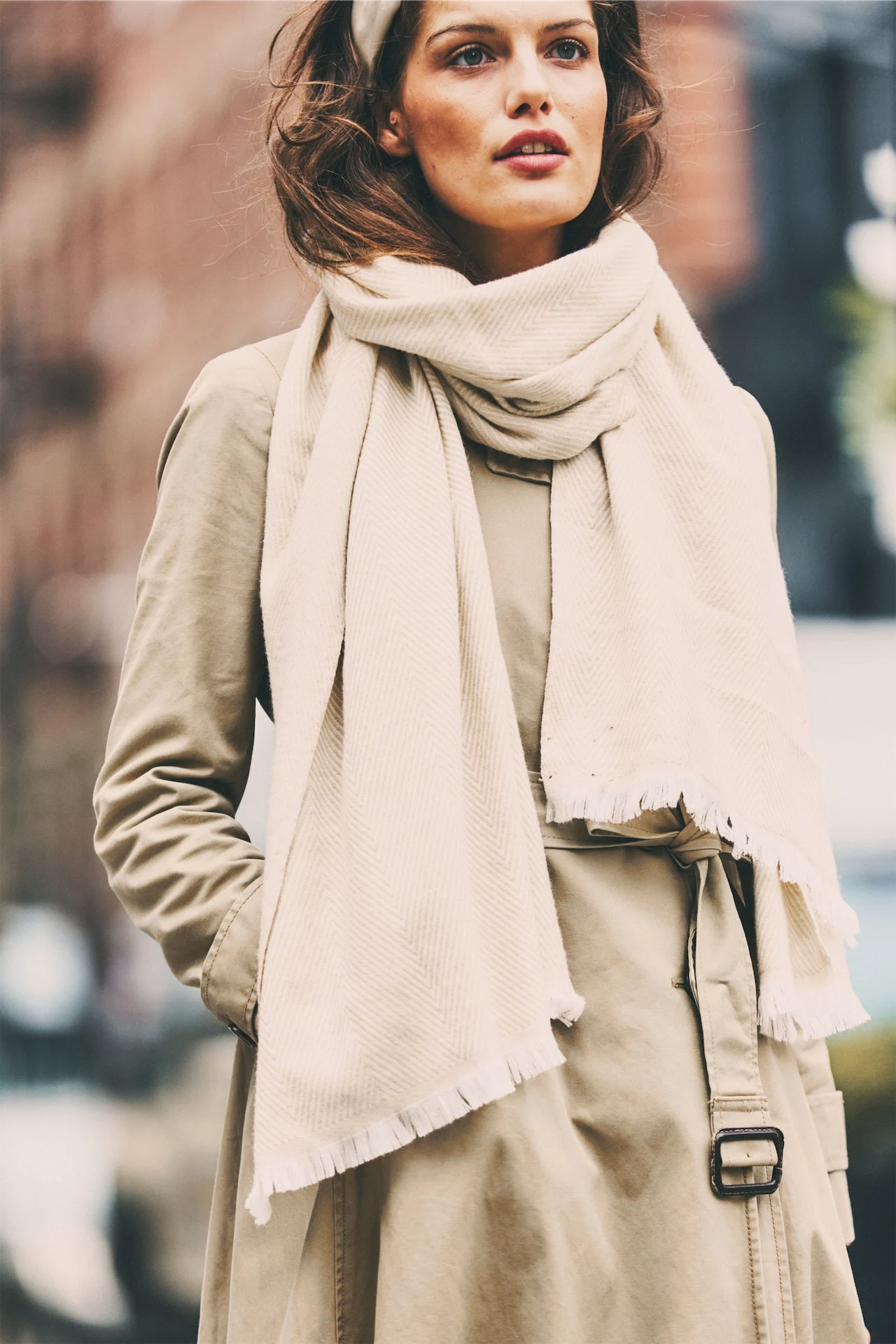 This chic cashmere and bamboo blend scarf feels just as soft and cosy as it looks. The thick herringbone weave will keep you warm on cold nights and its cream tones will match with any coat.