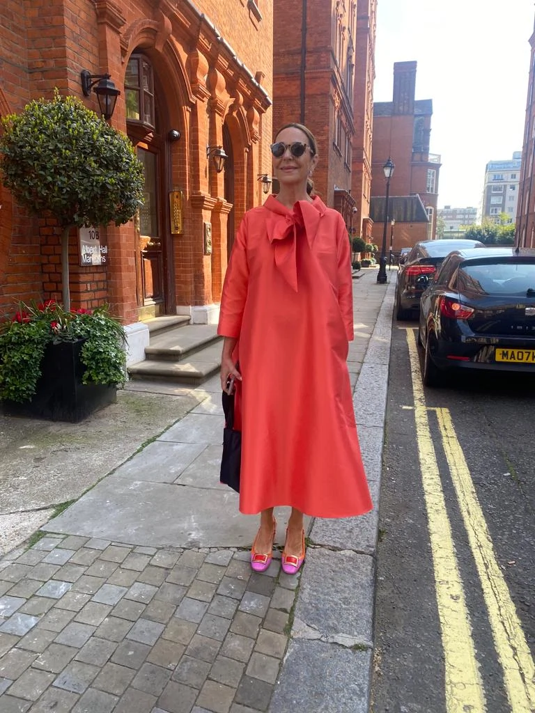After my workout, I changed into something a little more glamorous. I simply adore this dress. I first got it when I was judging Best Dress for Bollinger at the Punchestown Races. It is Ember in orange by Roisin Linnane. Today I am wearing it to my son’s graduation at the Royal Albert Hall in London. I love the shape, the colour, the cut, and the fabric of this dress. I put this into my carry-on case and when I took it out in London there was hardly a crease in it. It is a great piece. It also has pockets which is one of my favourite things! The A-line shape and the beautiful bow at the front make it such an elegant piece. I really love the vibrancy of this dress, the colour is amazing which makes you feel amazing. I love the power of dopamine dressing, wearing bright colours really affects the way we feel. A pop of colour like this makes me feel so alive. My sunglasses are &Other Stories and my earrings are from Boodles. My shoes are 1-inch slingback block heels from Hispanitas in El Corte Inglés. They were so comfortable all day and I love the mix of colours with the dress. My bag is by Irish designer August Night, which I wear on repeat. Today was such a memorable day for me and it was such a joy to wear something so special to mark the occasion.