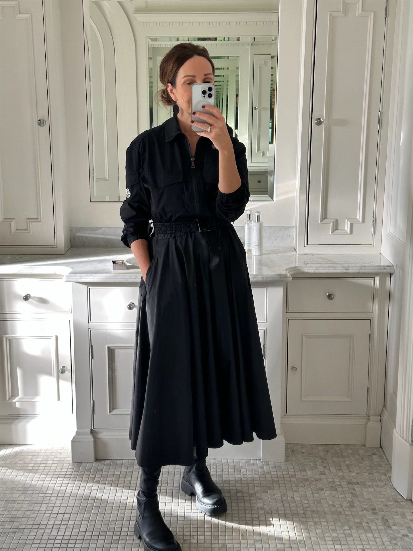 As a personal stylist in Kildare Village, I am always on the run from shop to shop seeking out the best style options for my clients. To keep up with my fast-paced day, I need comfort and practicality above all else. This elegant, easy-to-wear black Moncler shirt dress is the perfect option for my busy day. The iconic Moncler belted waist mixed with the zip front makes it a wonderful option for casual or elevated events. With the unpredictable weather we get in Ireland, the nylon fabric of the skirt is perfect as the rain rolls right off! This dress is so reliable for everyday wear, it is the perfect combination of comfort and class. Today I paired it with really comfortable black boots from Massimo Dutti and fabulous leather earrings from Irish designer Siobhán Daly. I get such great wear out of this dress that I bought it in a khaki green this year – it pairs perfectly with white trainers for a casual stylish look.
